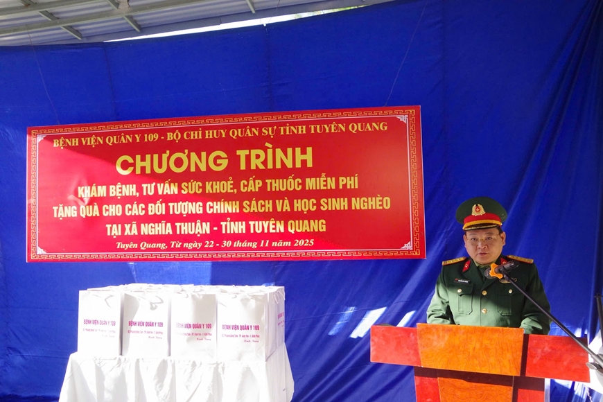 | Đại tá, bác sĩ chuyên khoa 2 Nguyễn Huy Hoàng, Giám đốc Bệnh viện Quân y 109, Cục Hậu cần-Kỹ thuật Quân khu 2 phát biểu khai mạc chương trình. |