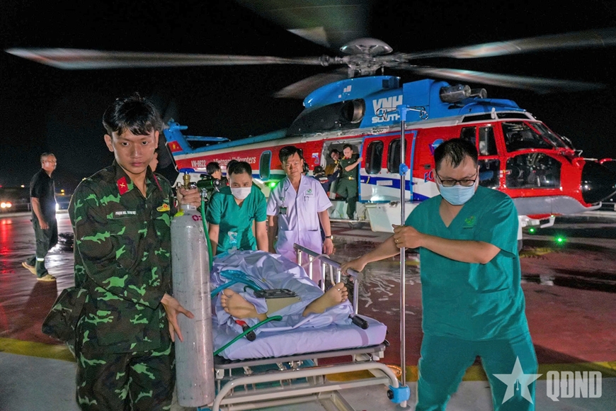 Hơn 14 giờ ngày 9-11, máy bay trực thăng EC225 số hiệu VN 8622 (Binh đoàn 18) cất cánh từ sân bay Tân Sơn Nhất, đưa tổ cấp cứu đường không ra đặc khu Trường Sa.