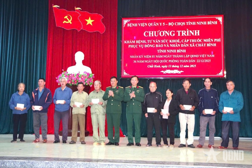 Nhân kỷ niệm 81 năm Ngày thành lập Quân đội nhân dân Việt Nam, 36 năm Ngày hội Quốc phòng toàn dân, sáng 13-12, Bệnh viện Quân y 5, Cục Hậu cần - Kỹ thuật Quân đoàn 12 chủ trì phối hợp với Bộ CHQS tỉnh Ninh Bình tổ chức chương trình khám bệnh, tư vấn sức khỏe, cấp thuốc miễn phí, tặng quà thương binh, bệnh binh, gia đình chính sách, hộ gia đình có hoàn cảnh khó khăn tại xã Chất Bình, tỉnh Ninh Bình.