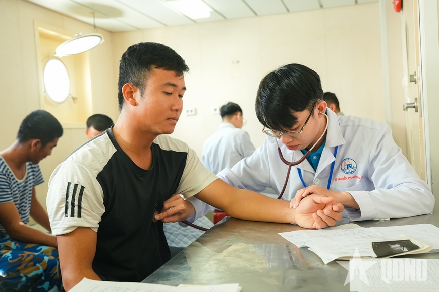 Các bác sĩ triển khai đồng bộ nhiều nội dung: Khám tổng quát, theo dõi chỉ số sinh tồn, siêu âm, đo điện tim, tầm soát tim mạch và các bệnh lý thường gặp trong điều kiện sinh hoạt trên đảo; đồng thời thực hiện chăm sóc răng miệng, xử lý một số thủ thuật cần thiết, tư vấn vệ sinh phòng bệnh phù hợp môi trường biển đảo. Cùng với đó là cấp phát thuốc, vitamin, thực phẩm bổ sung và hướng dẫn cán bộ, chiến sĩ cách tự theo dõi sức khỏe, nhận biết sớm dấu hiệu bệnh lý.