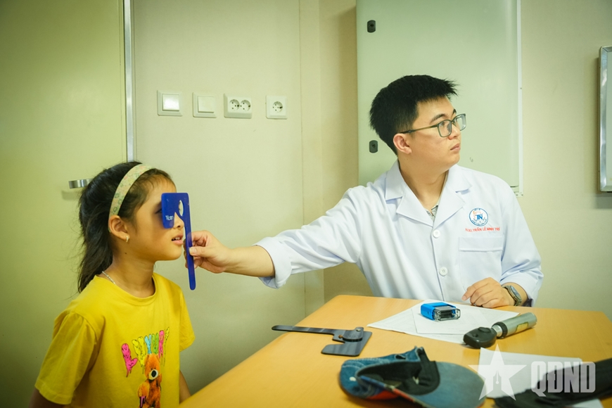 | Bác sĩ khám mắt cho con em của cán bộ, chiến sĩ đang công tác trên đảo. |