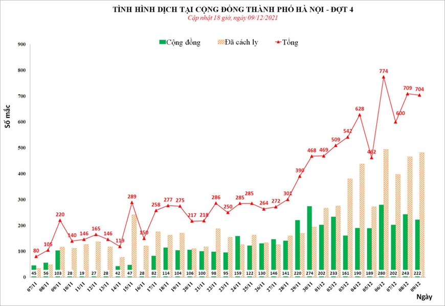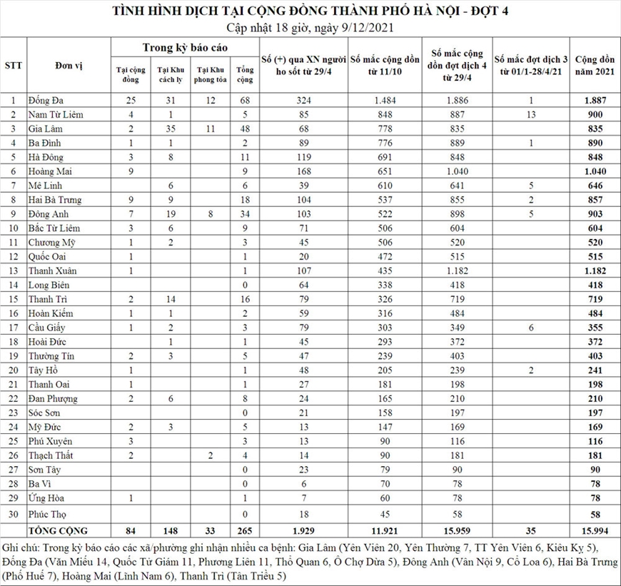 Cộng dồn số mắc Covid tại Hà Nội trong đợt dịch 4 (từ ngày 29-4-2021): 15.959 ca trong đó số mắc ghi nhận ngoài cộng đồng 6.069 ca, số mắc là đối tượng đã được cách ly 9.890 ca.