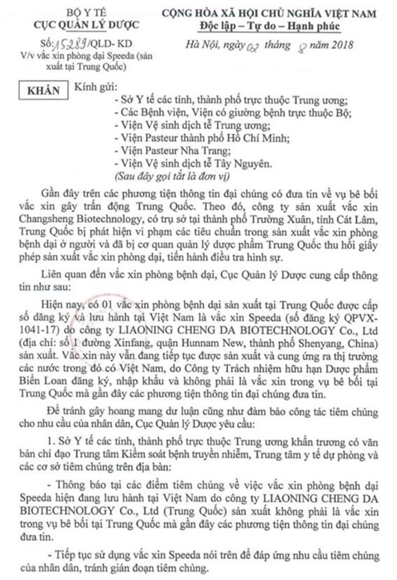 Để tránh hoang mang dư luận cũng như đảm bảo công tác tiêm chủng cho nhu cầu của nhân dân, Cục Quản lý Dược yêu cầu Sở Y tế các tỉnh, thành phố trực thuộc Trung ương khẩn trương có văn bản chỉ đạo Trung tâm Kiểm soát bệnh truyền nhiễm, Trung tâm y tế dự phòng và các cơ sở tiêm chủng trên địa bàn thông báo tại các điểm tiêm chủng về vắc-xin phòng dại Speeda hiện đang lưu hành tại Việt Nam do công ty LIAONING CHENG DA BIOTECHNOLOGY Co., Ltd (Trung Quốc) sản xuất không phải là vắc-xin trong vụ bê bối tại Trung Quốc mà gần đây các phương tiện truyền thông đại chúng đưa tin. Cục Quản lý Dược yêu cầu các đơn vị tiếp tục sử dụng vắc-xin Speeda nói trên để đáp ứng nhu cầu tiêm chủng của nhân dân, tránh gián đoạn tiêm chủng.