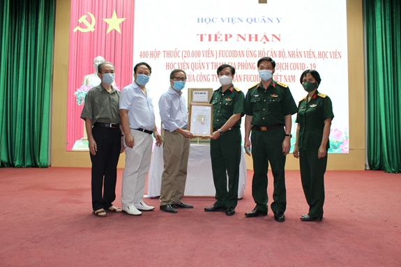 | Đại diện Công ty Cổ phần Fucoidan Việt Nam tặng 20.000 viên Fucoidan cho Học viện Quân y. |