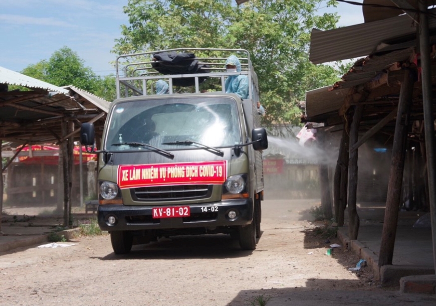 | Cán bộ, chiến sĩ Sư đoàn 2 (Quân khu 5) giúp địa phương phun hóa chất chống dịch. |