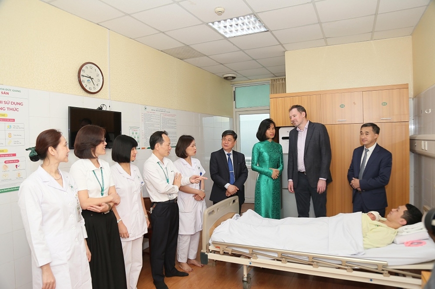 Đoàn đại biểu Chính phủ Ireland và lãnh đạo Bộ Y tế thăm gia đình trẻ sơ sinh đang điều trị bằng phương pháp chăm sóc Kangaroo tại Bệnh viện Đa khoa Đức Giang. Ảnh: TRẦN ANH