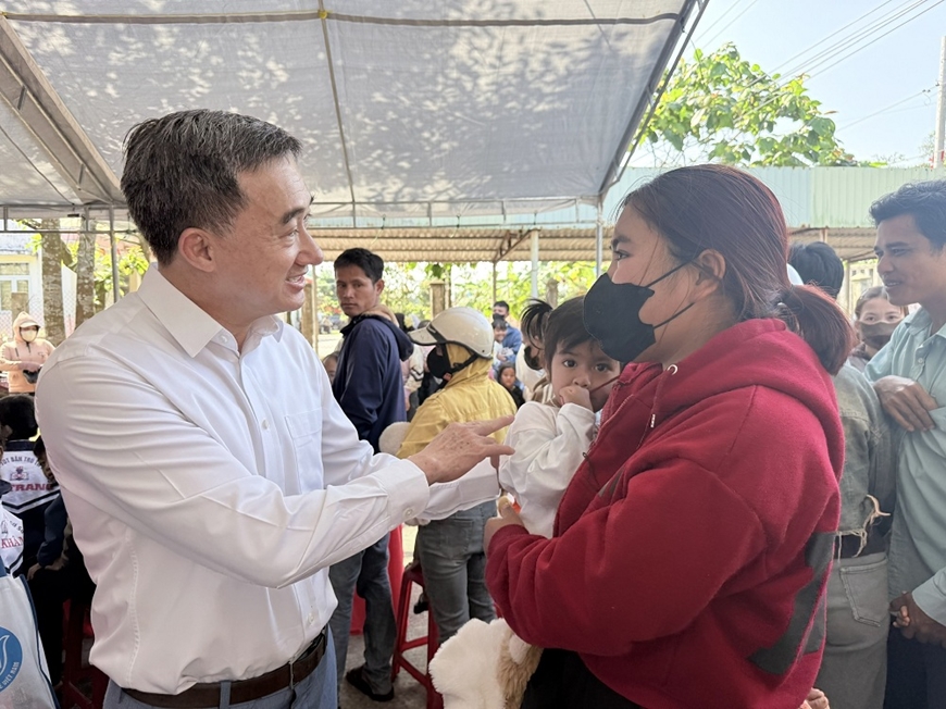 | Thứ trưởng Bộ Y tế Trần Văn Thuấn trò chuyện, tặng quà hộ dân có hoàn cảnh khó khăn của xã Đặng Thùy Trâm. Ảnh: THÁI BÌNH |