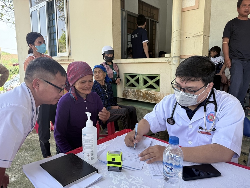 Các y bác sĩ thăm khám, tư vấn sức khỏe cho người dân xã Đặng Thùy Trâm. Ảnh: THÁI BÌNH