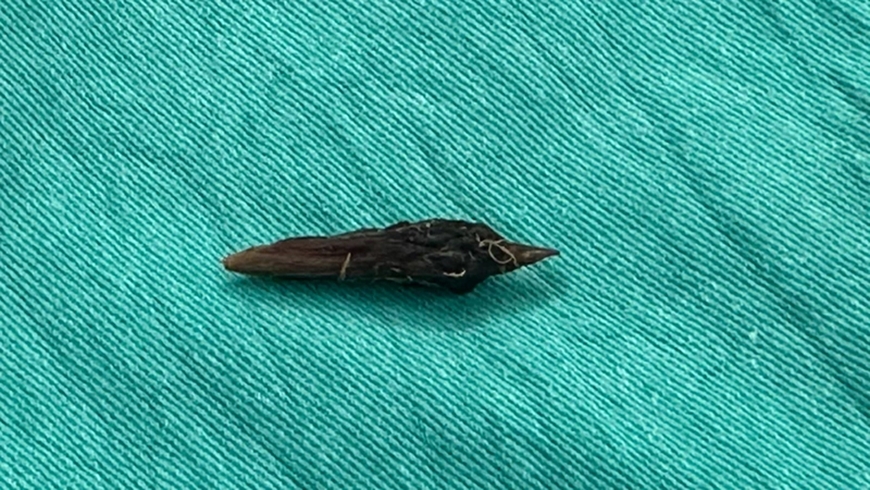 Khi tiến hành phẫu thuật mở rộng để kiểm tra tổn thương đoạn cuối ruột non, các bác sĩ phát hiện một lỗ thủng trên thành ruột, tại đây có một dị vật sắc nhọn chọc ra ngoài.
