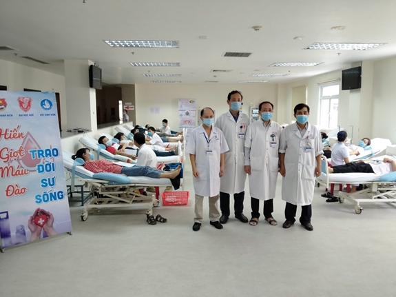 TS Đồng Sỹ Sằng (ngoài cùng bên phải) tại buổi hiến máu của Bệnh viện Trung ương Huế. |