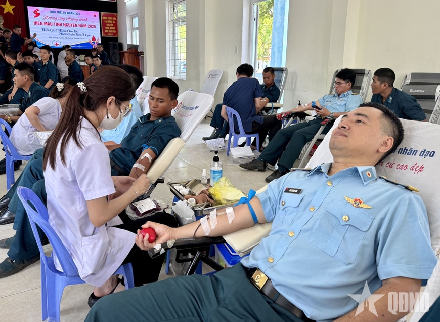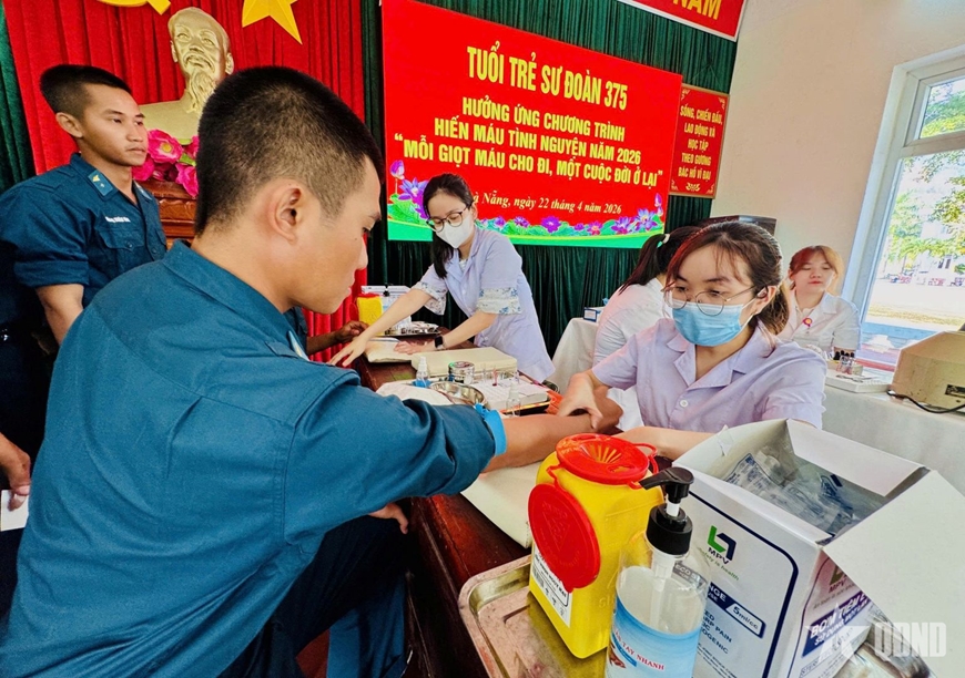 Sáng 22-4, Sư đoàn Phòng không 375 (Quân chủng Phòng không - Không quân) phối hợp với Thành đoàn Đà Nẵng và Bệnh viện Đa khoa Đà Nẵng tổ chức hưởng ứng Ngày hội hiến máu tình nguyện năm 2026. Tham gia ngày hội có các chiến sĩ mới nhập ngũ năm 2026 thuộc Tiểu đoàn Huấn luyện chiến sĩ mới.