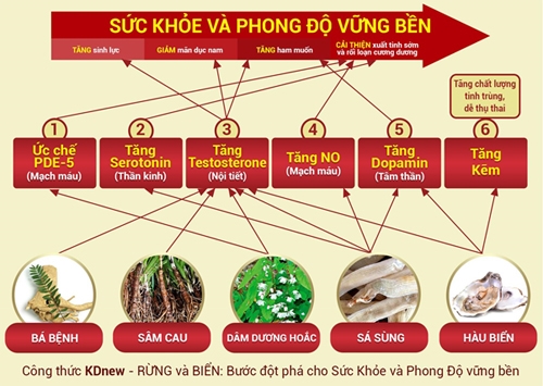 Để giúp quý ông duy trì phong độ không chỉ trong dịp Tết đến xuân về, mà còn bền vững theo thời gian, công thức KDnew ra đời với sự kết hợp độc đáo lần đầu tiên giữa RỪNG và BIỂN: gồm 3 thảo dược quý của núi rừng (Dâm dương hoắc, Sâm cau, Bá bệnh) và 2 dược liệu quý của biển (Hàu, Sá sùng). Từ đó, tác động vào 4 cơ chế duy trì “bản lĩnh” phái mạnh: nội tiết (Testosterone), thần kinh, tâm thần, mạch máu, giúp đấng mày râu cân bằng sinh lực – sinh lý an toàn, hiệu quả.