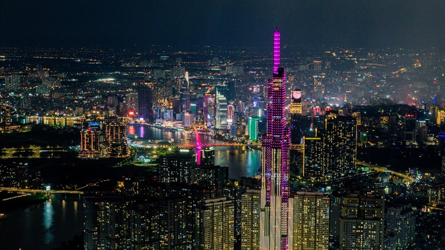 Tòa nhà Landmark 81 (Thành phố Hồ Chí Minh), tòa nhà cao nhất Việt Nam cũng khoác lên mình một màu hồng rực rỡ. |
