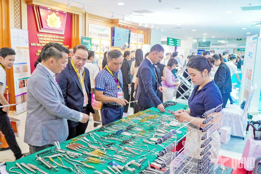 | Các chuyên gia, đại biểu tham quan những gian hàng giới thiệu trang thiết bị hiện đại ngành phẫu thuật tạo hình. |