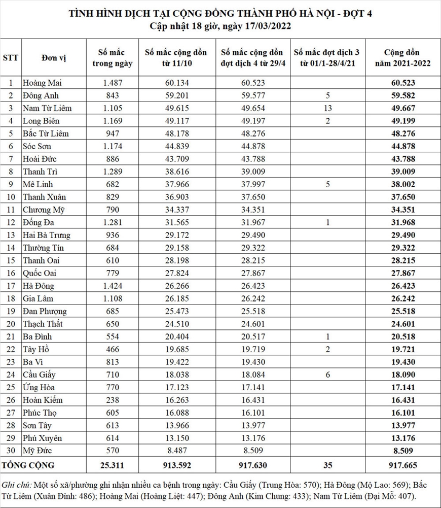 Một số quận, huyện ghi nhận nhiều bệnh nhân trong ngày như: Hoàng Mai (1.487); Hà Đông (1.424); Thanh Trì (1.289); Đống Đa (1.281); Sóc Sơn (1.174).