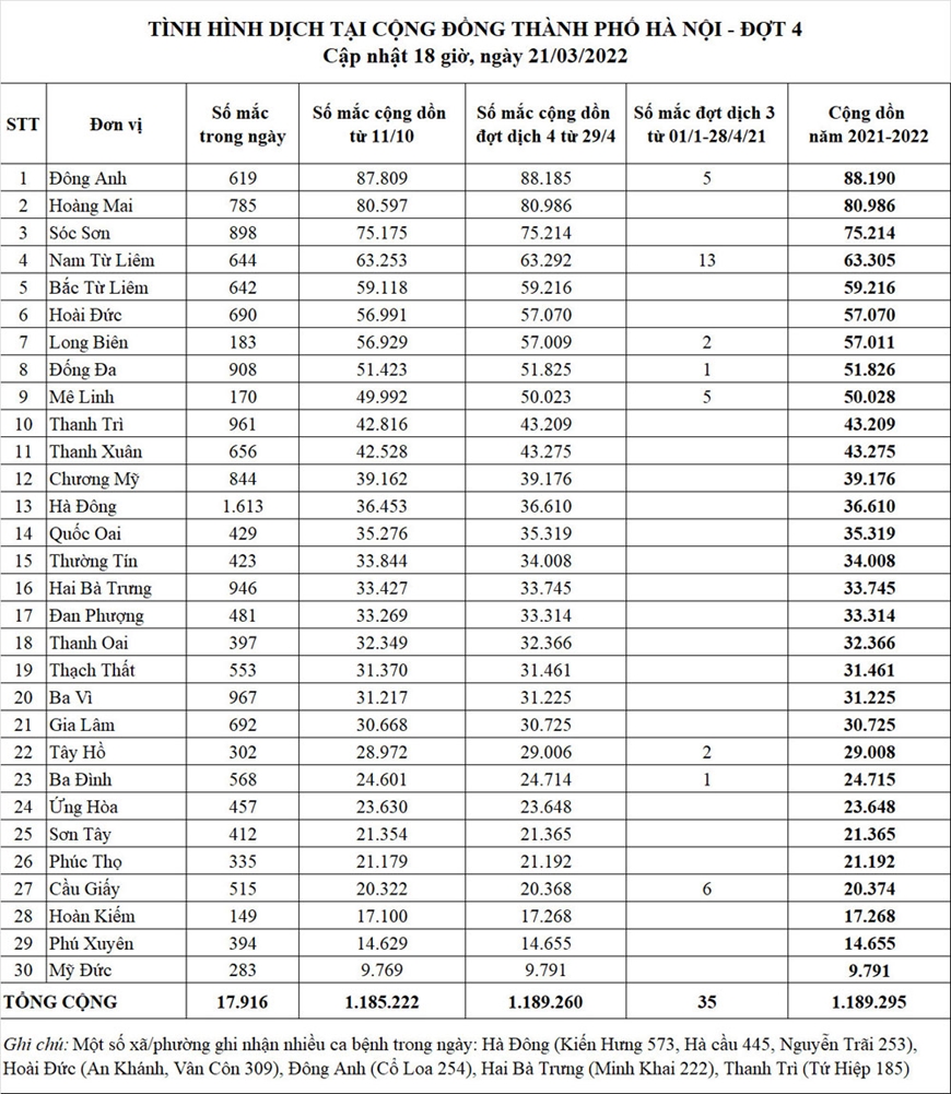 Một số quận, huyện ghi nhận nhiều bệnh nhân trong ngày như: Hà Đông (1.613); Ba Vì (967); Thanh Trì (961); Hai Bà Trưng (946); Đống Đa (908).