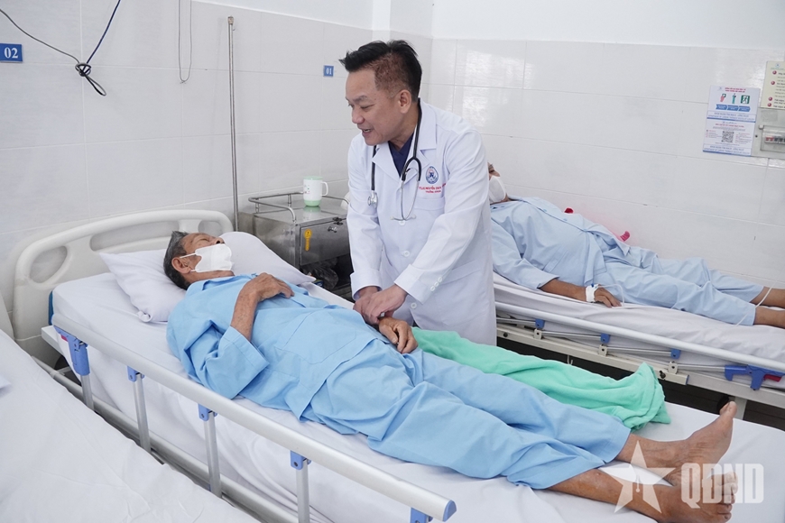 | Đại diện đội ngũ bác sĩ Khoa Ngoại Tim mạch lồng ngực, Bệnh viện Thống Nhất thăm khám sức khỏe cho bệnh nhân tắc hẹp động mạch chi dưới đa tầng. Ảnh: NHẬT THÀNH |